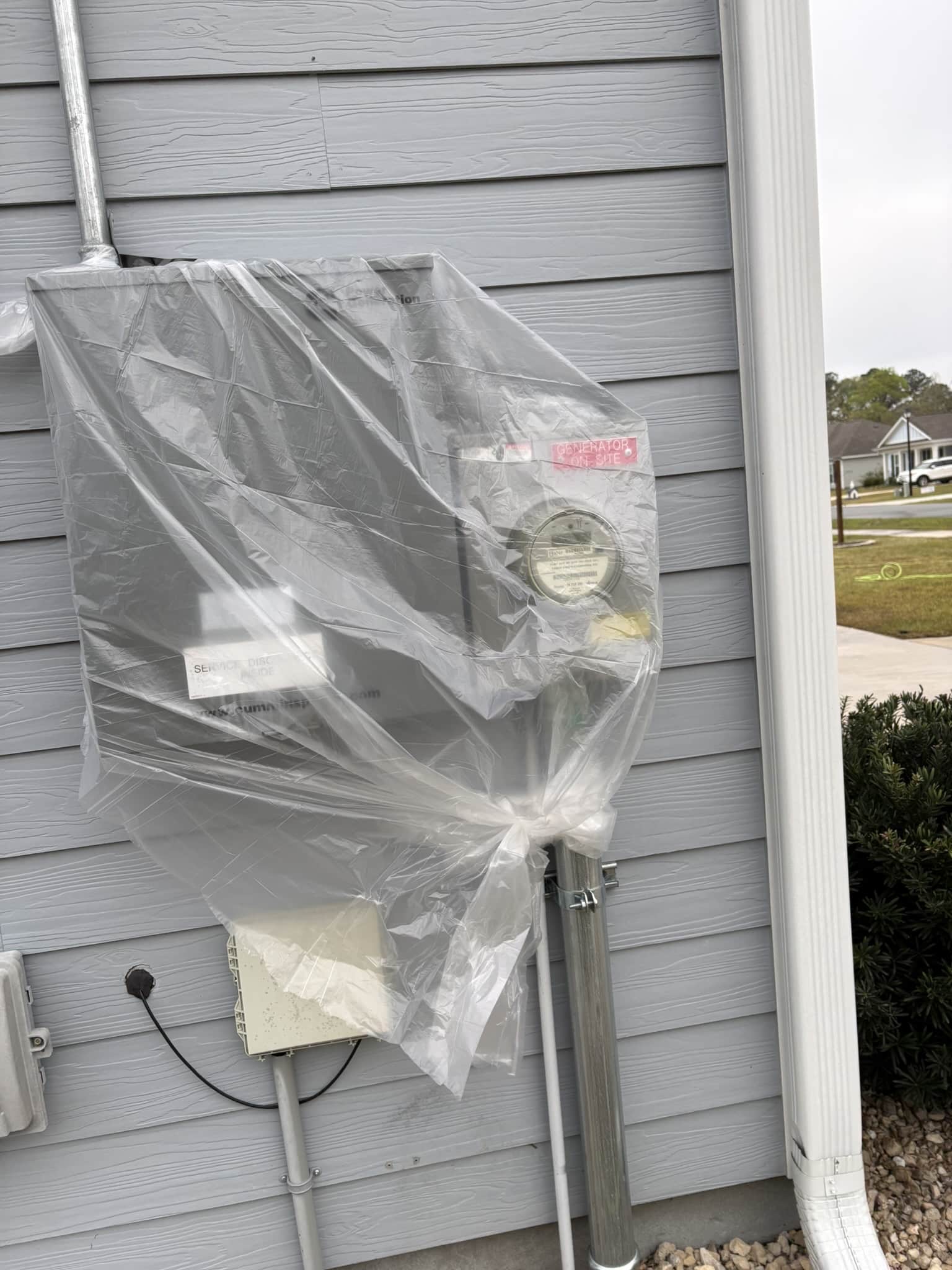 We carefully taped up all the exterior outlets and door locks. We also securely covered all the exterior security cameras. Because this home had a whole-house generator, we made sure to completely cover the transfer switch with plastic to keep it dry and protected from our cleaning solutions and rinse water.